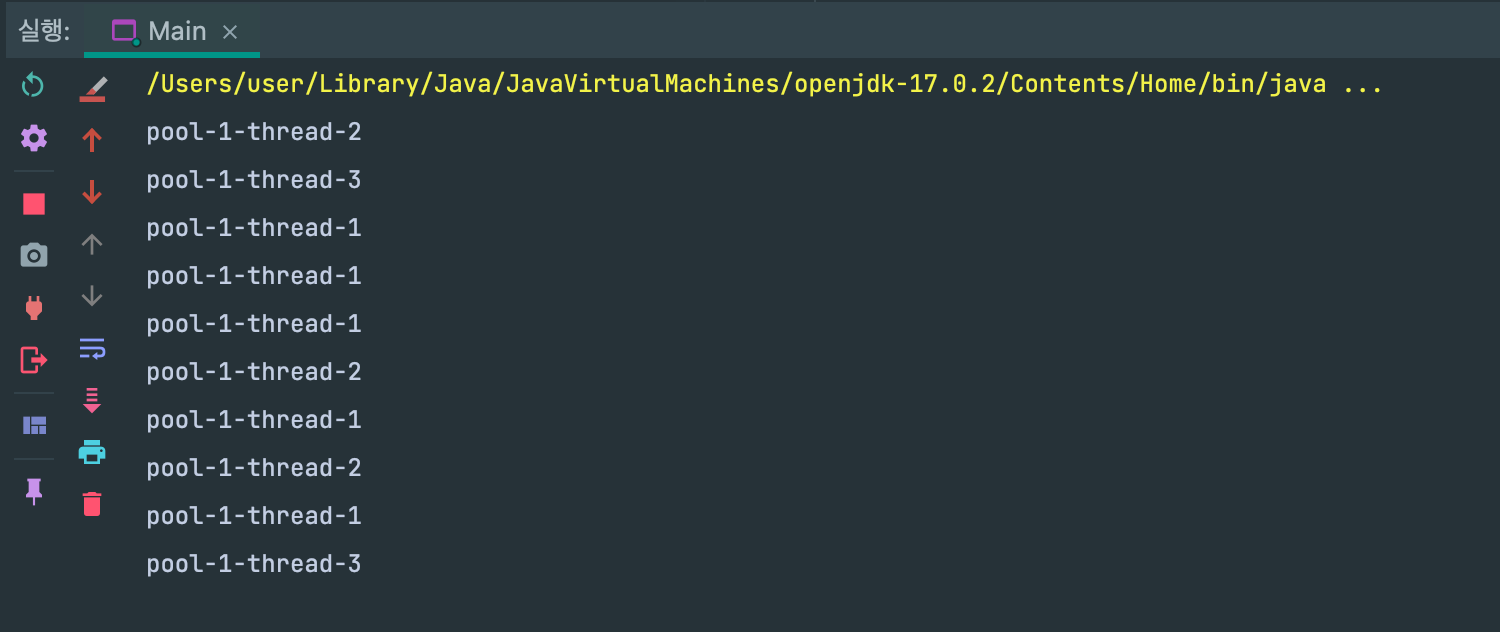 3개의 쓰레드를 가진 쓰레드풀을 생성해서 printMyThreadName()이라는 작업을 10번을 처리했습니다.