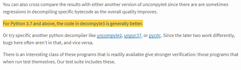 python 3.7 이상 버전에서는 Uncompyle6은 많은 문제가 발생하고, decompile3을 권장한다는 내용이었습니다.