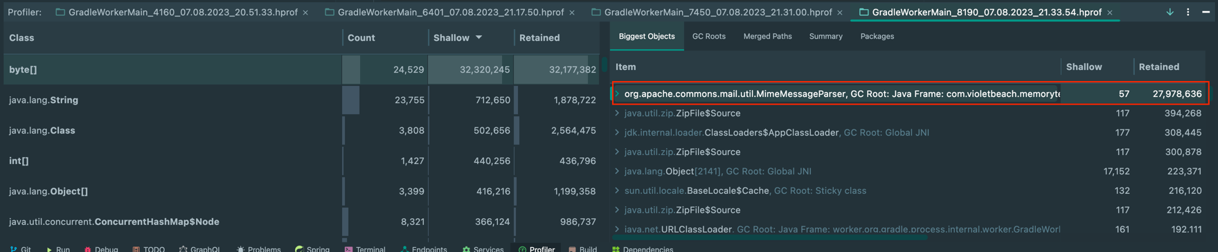 포스팅 제목을 무지성byte[] 사용하지 않기라고 했는데 불필요하게 전체 byte[] 할당하지 않기라고 봐주면 좋을 것 같다.해당 포스팅에서는 서비스 운영 중 byte[]로 인해 심각한 문제가 생겼고, 오픈소스 기여까지 하게된 내용을 작성한다.TPS가 심각하게 낮음메일 파일(약 20MB)을 읽어서 파일의 내용 중 일부를 화면에 노출하는 기능을 개발했다.그런데 POD 1대의 TPS가 1.7 정도밖에 나오지 않았다.전체 HTTP 트랜잭션은 5.42초였다.그래서 아래와 같이 각 로직의 수행 시간을 측정해봤다.그 결과 parse 로직이 3787ms가 걸린다는 것을 알 수 있었다.parseparse()의 경우 외부 라이브러리(apache-commons-email)의 로직만을 담고 있었다. 상세한 확인으로 아래 부..