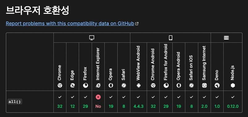 Ajax 결과 대기 기존에는 Ajax로 요청 하나만 보내는 것을 MSA를 도입하면서 4가지 API에 요청해서 결과를 조합하도록 수정해야 하는 상황이 발생했다. 관련하여 요즘 많이 사용하는 메소드가 Promise.all()이다. 사내에서 운영중인 서비스는 IE도 고려해야해서 ES6 문법을 사용할 수 없었다. 혹시나 싶어서 호환성을 살펴봤는데, 역시나 IE 지원이 안된다. async: false Ajax 요청은 기본적으로 비동기로 동작한다. Ajax 속성 중에 async를 false로 설정하면 동기 방식으로 동작한다. $.ajax({ type: 'get', url: API_URL+'/users?query='+search, contentType: 'application/json; charset=utf-8', ..